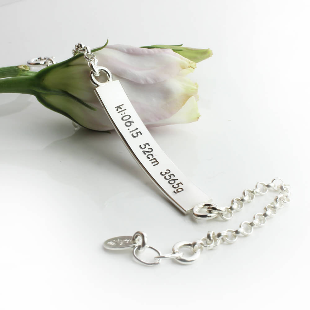 Dessa smycken till barn tillverkar vi i 925 sterlingsilver. På detta vackra barnarmband finns plats för att föreviga en egen graverad text på 15 tecken.