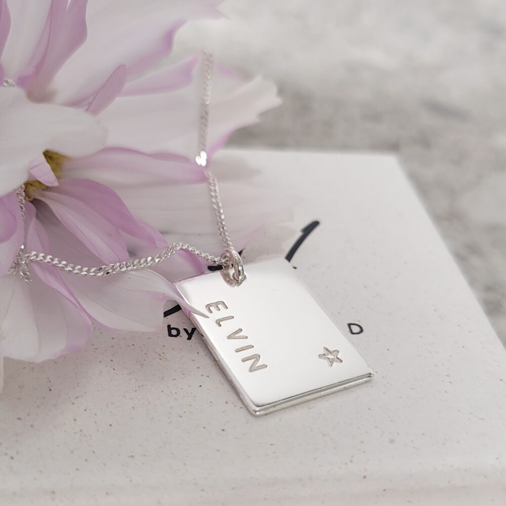 Gravyrsmycke till barn, vårt populäraste barnsmycke som dopgåva till pojkar är denna lilla bricka. Vi tycker det är så kul att även pojkarna får ett smycke i doppresent. På framsidan ingår ett namn och en liten symbol. Ofta väljer man också att lägga till datum, tid vikt och längd på baksidan.