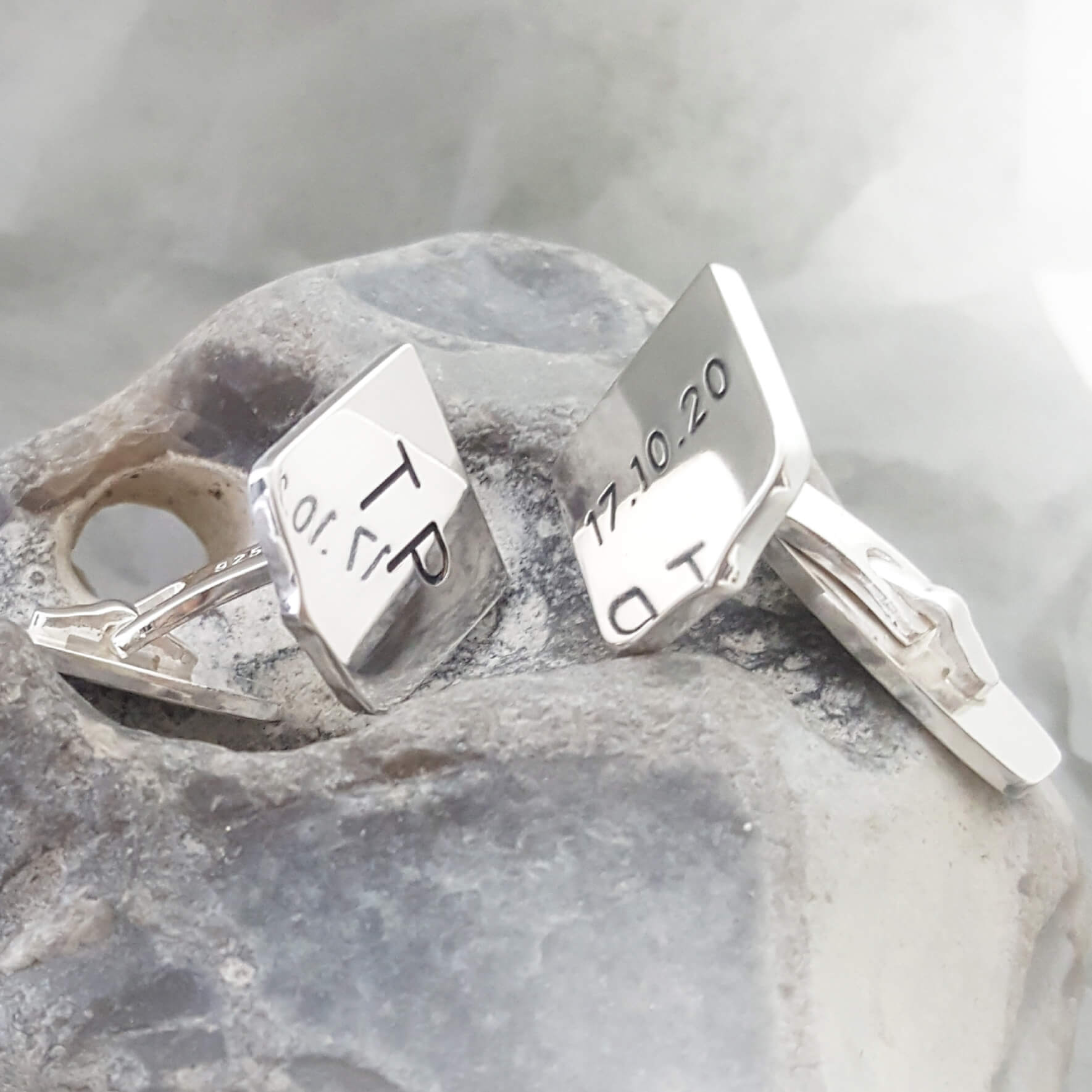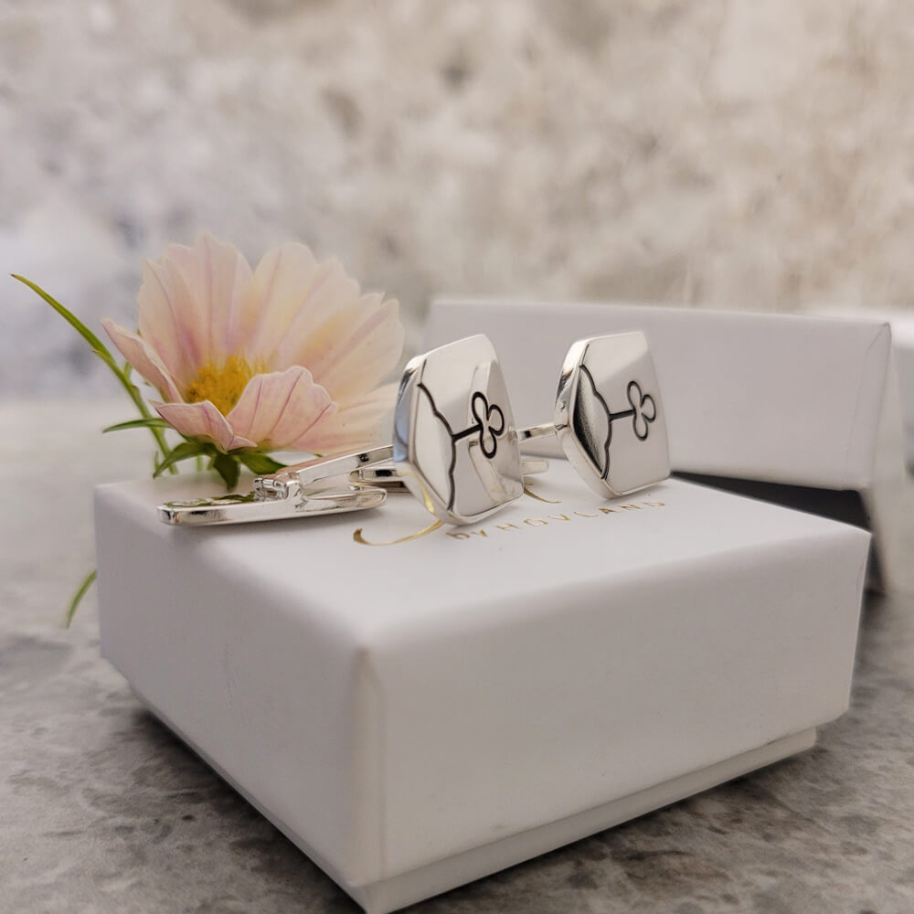 Snygga manschettknappar med bild gravyr i silver med en stilren design. Manschettknapparna är exklusiva och har en härlig tyngd. Vi tillverkar dem tillsammans med din text eller bild för så att de blir ett väldigt personligt herrsmycke i silver. Är du nyfiken på hur man använder dem kan du läsa mer här