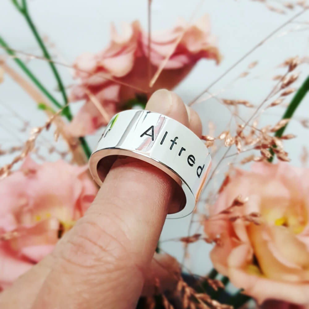 Graverade silverringar med namn eller en text. Ringen är 10mm bred och 2mm tjock. På grund av att vi gör den så tjock går den att gravera på kanterna. När vi graverar silverringen gör vi det med djupgravyr. Genom detta blir det en slittålig gravyr och ringen tåls att användas varje dag. Som med alla våra smycken tillverkar vi din silverring med gravyr för hand i vår egen ateljé. Till varje enskild ring anpassar vi gravyren för att passa just din ring på bästa sätt med mycket kärlek och noggrannhet.