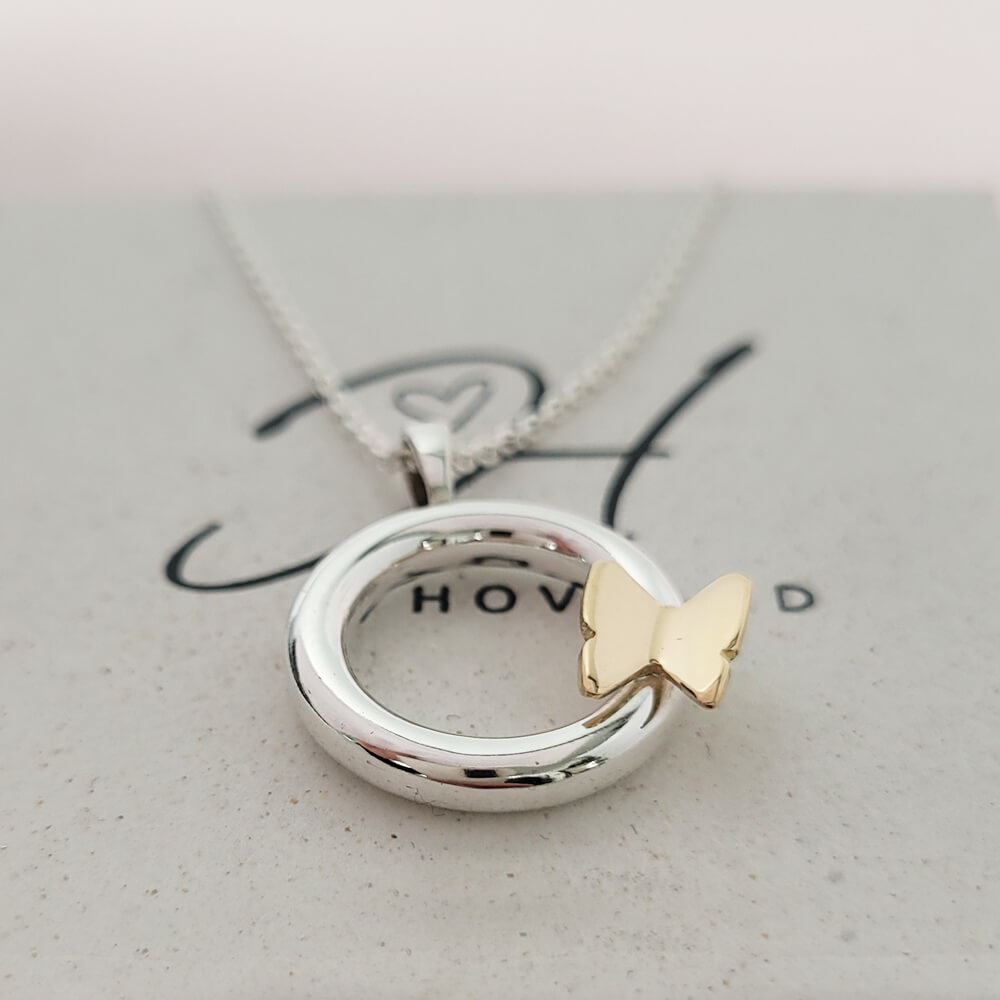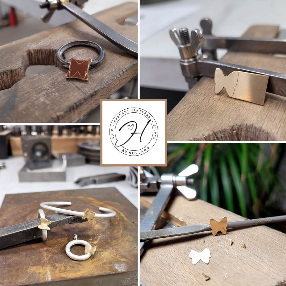 Silverhalsband med fjäril i 18k på en tunn ankarkedja. Vi gör alla tillverkningsmomenten efter din beställning, som sågning, formning, lödning, slipning, polering helt för hand i vår egen ateljé.