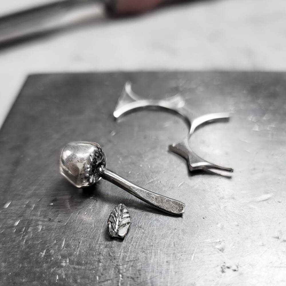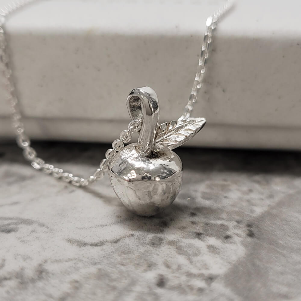 Varje äpple är unik då vi tillverkar dessa genom att smälta silverspill och hälla i kol som jag skär ut för varje äpple. Stjälken tvingar jag sedan ner i det flytande silvret för att bilda äppelformen. På frihand tillverkar jag det lilla bladet innan jag löder fast det på äpplet. Således är detta ett smycke tillverkat med massor av kärlek och hjärta, helt enkelt ett hållbart och genuint hantverk. Genom att berlocken är massivt får det lilla äpplet en härlig tyngd. Så se till att använda ditt halsband ofta och mycket, de är tillverkade för att hålla.