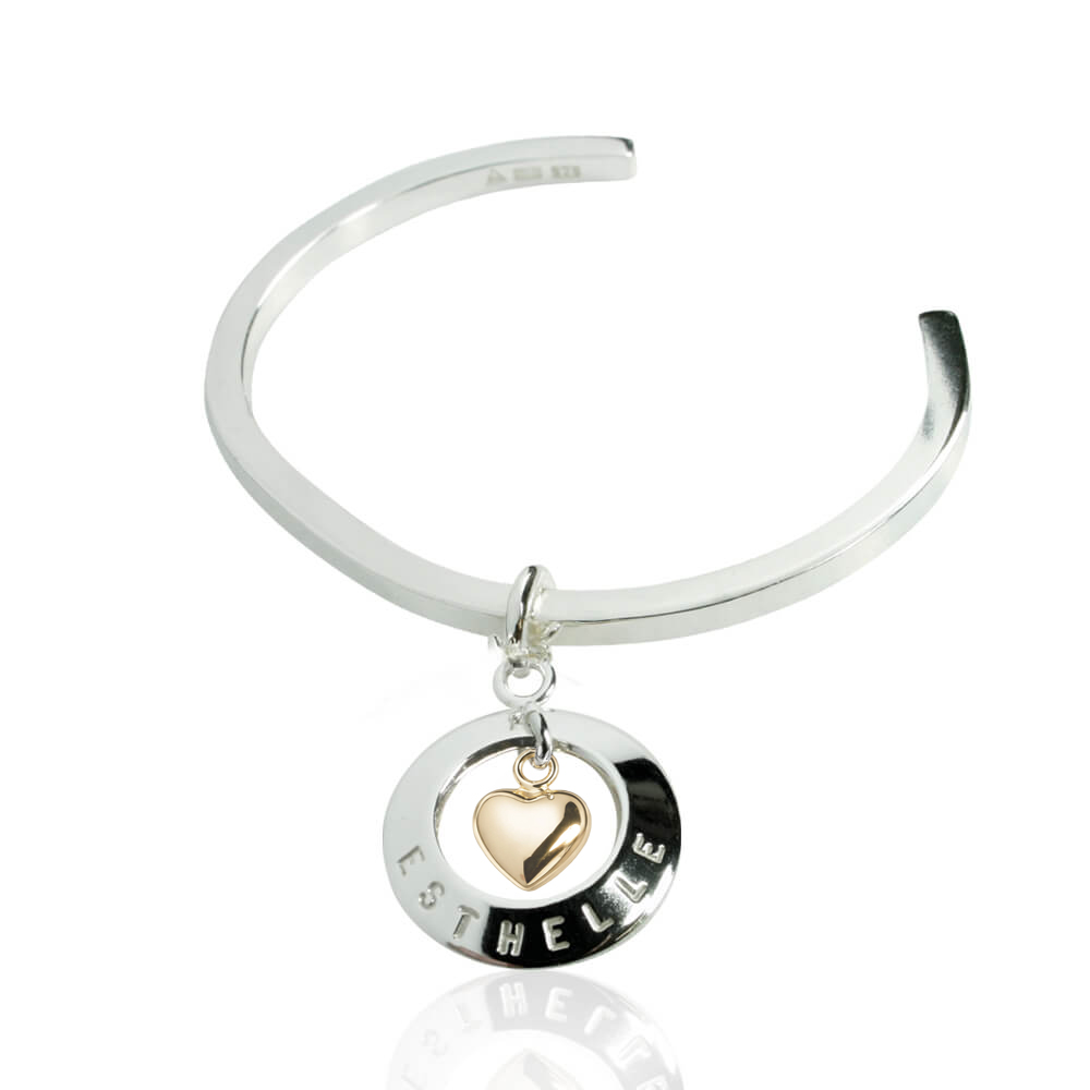 Heart of gold armring har en stilren design. På armringen hänger en kupad cirkel med hjärta i mitten. Cirkeln sitter fast så den åker inte omkring på armringen. Det ingår 1 namn. Ange armleds mått vid beställning av detta silversmycke.