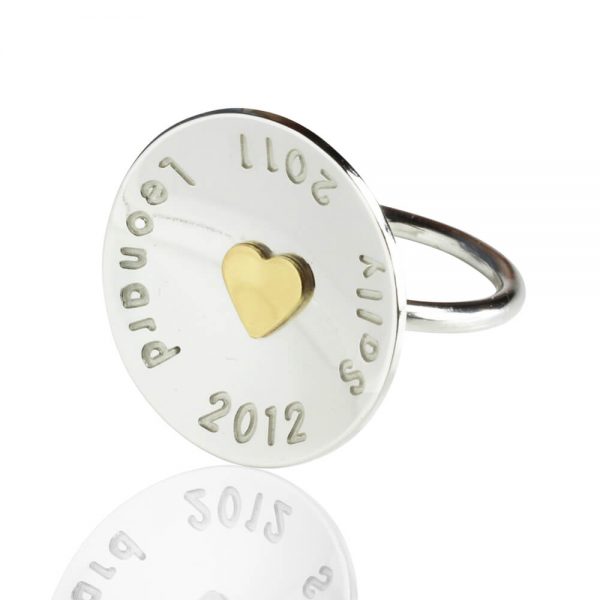 Ringen har en stor platta med ett 18k guldhjärta i mitten. Ringbågen är rund och handgjord i 2mm tjockt gods. Pricken är hela 22mm stor och lätt kupad.
